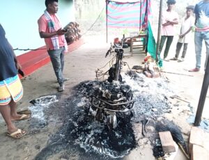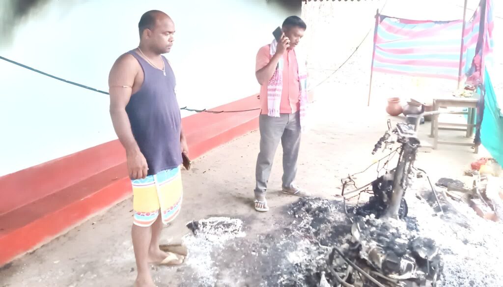 खरसावां थाना क्षेत्र के अंतर्गत कोतवालवादी गंाव में सोमवार देर रात अज्ञात बदमाशों ने घर के आंगन में खड़ी एक नई होंडा डिओ स्कूटी को आग के हवाले कर दिया। घटना में स्कूटी पूरी तरह जलकर राख हो गई, जिससे पीड़ित परिवार को भारी नुकसान हुआ है। स्कूटी के मालिक लालमोहन पड़िया ने बताया कि विगत 18 मार्च-2026 को परिवार की जरूरत के लिए सरायकेला स्थित होंडा शोरूम से 125 सीसी डियो कंपनी की नई स्कूटी करीब 1.20 लाख रुपये में खरीदी थी।