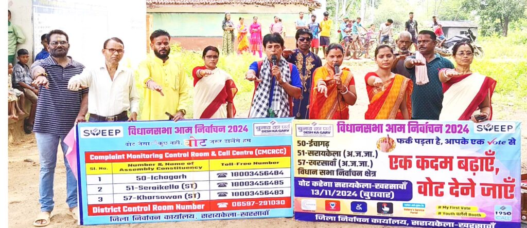 Jharkhand Assembly Election जिला जनसंपर्क विभाग सरायकेला खरसावां के सौज्नीय एवं लोक कला मंच खरसावां के द्वारा सरायकेला प्रखंड के अंतर्गत सीनी के मोहितपुर और मुंडाटांड में नुक्क्ड नाटक कर आगामी विधानसभा चुनाव में मतदाताओं को मत के अधिकार को लेकर जोश जगाया। लोक कला मंच के कलाकारों ने प्रस्तुति दी। इस दौरान नुक्कड़ नाटक के माध्यम से मतदाताओं को समाज के जिम्मेदार सदस्यों के रूप में अपनी सक्रिय भागीदारी दिखाने के लिए प्रोत्साहित किया गया। कलाकारों ने अपने मनमोहक प्रदर्शन से राहगीरों का ध्यान आकर्षित किया। इसमें भारत के लोकतांत्रिक परिदृश्य को आकार देने में उनकी भागीदारी के महत्व पर जोर दिया गया था। कलाकारों ने मतदान को एक विशाल लोकतांत्रिक त्योहार के रूप में चित्रित किया है, जो भारतीय लोकतंत्र की आधारशिला के रूप में इसके महत्व को रेखांकित करता है। भारत के चुनाव आयोग की अपील में कलाकारो ने लोगों से आग्रह किया कि वे अपना वोट डालकर योग्य प्रतिनिधियों को चुनने का अवसर न चूकें। उन्होंने धार्मिक या राजनीतिक संबद्धता के बजाय योग्यता के आधार पर उम्मीदवारों के चयन को प्राथमिकता देने की आवश्यकता पर जोर दिया। साथ ही लोगों मतदान करने की शपथ दिलाया।