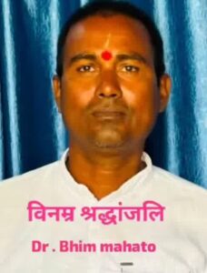 सरायकेला प्रखण्ड अन्तर्गत महालिमोरूप में स्थित मार्केट पर स्थानीय लोगों द्वारा डाॅ. भीम महतो के आकस्मिक निधन पर श्रद्धांजलि सभा का आयोजन किया गया। कार्यक्रम की शुरुआत डाॅ भीम महतो के चित्र पर पुष्प अर्पित कर किया गया। मौके पर मुरुप पंचायत के पूर्व मुखिया धनुराम महाली ने कहा कि उनके निधन से पंचायत के लोगो को गहरा आघात पहुंचा है। वह सिर्फ चिकित्सक ही नहीं थे, बल्कि लोगों के मार्गदर्शक भी थे। उनका अचानक निधन हो जाने से क्षेत्र के लोगों को अपूर्णीय क्षति हुई है। वही ग्राम प्रधान अश्वनी कुमार सिंहदेव ने बताया कि वह एक सरल स्वभाव और मिलनसार व्यक्ति थे।