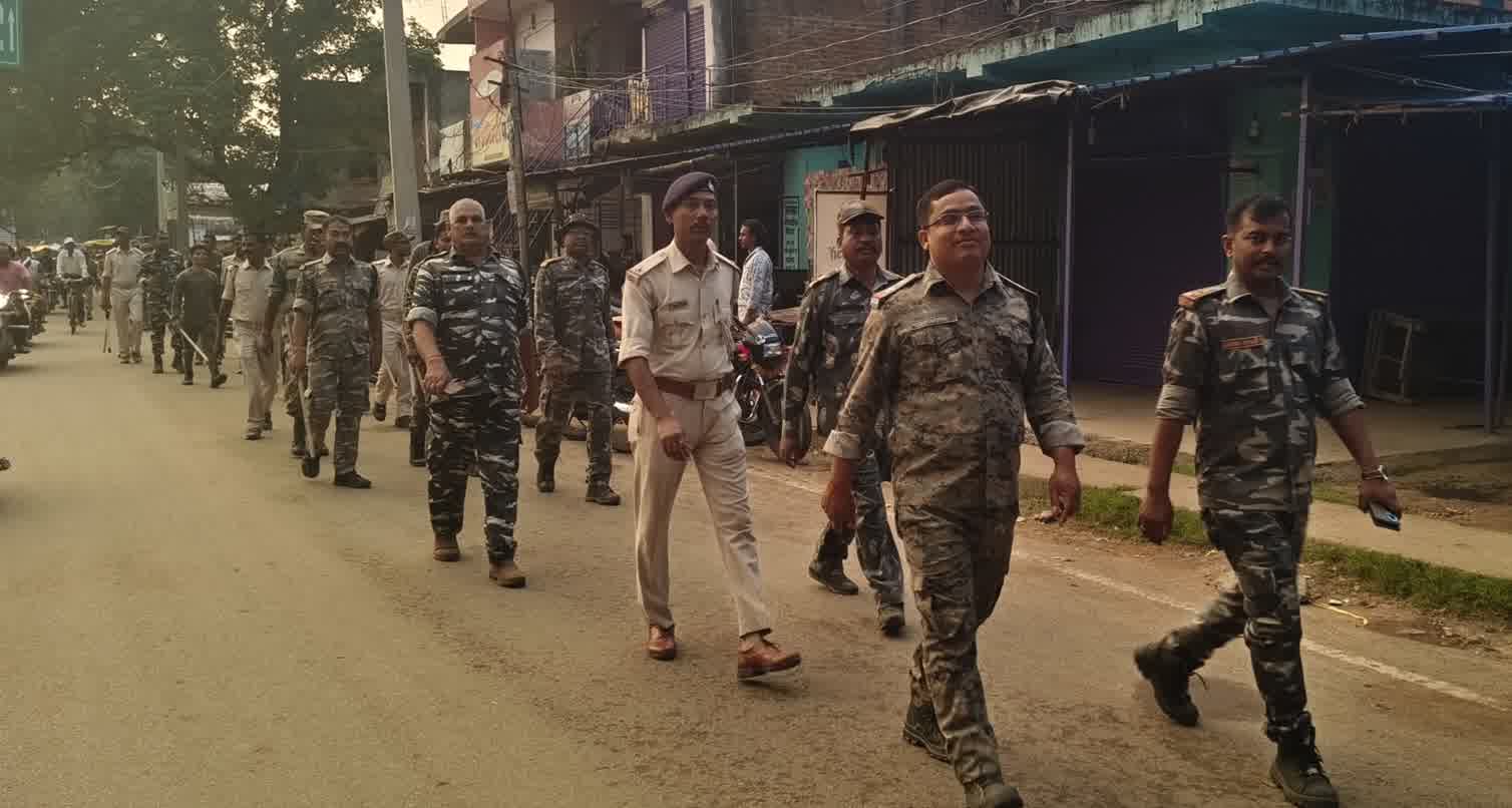 खरसावां मे दुर्गा पूजा को लेकर पुलिस का निकला फ्लैग मार्च, शांति व्यवस्था बनाए रखने की अपील,
