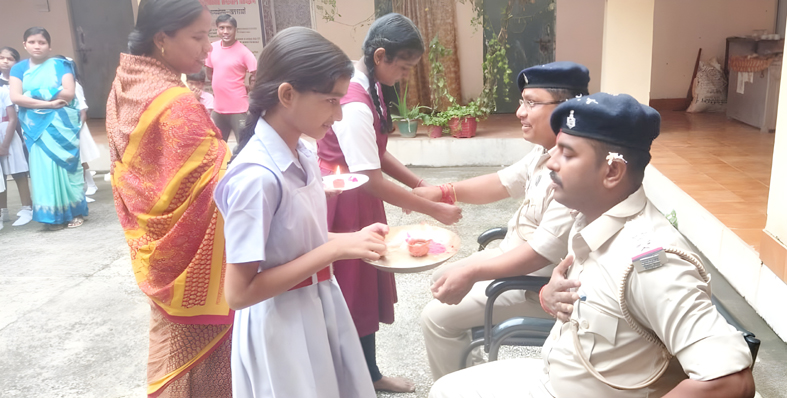खरसावां के राजमहल परिसर में संचालित सरस्वती शिशु मंदिर के बहनों ने खरसावां थाना प्रभारी के साथ साथ बाकी सिपाहियों को माथे पर चंदन की तिलक, पुष्प सह दीप से आरती उतार कर, हाथ में रक्षा सूत्र बांधकर रक्षा बंधन उत्सव मनाए। सभी बहनों को रक्षा बंधन का शुभकामनाएं देते हुए थाना प्रभारी गौरव कुमार ने विद्यालय के बहनों को उपहार स्परूप नारी सुरक्षा को लेकर कहा कि क्षेत्र में स्कूल आते जाते या विद्यालय के अंदर या समाज में किसी तरह की भी समस्या हो या कोई किसी महिला को परेशान करे तो वो 112 पर कॉल करने या थाना में सीधे संपर्क करने के लिए कहे। साथ ही रक्षा बंधन के पवित्र भाई बहन के स्नेह और प्यार की बात कही। मौके पर थाना के सब इंस्पेक्टर प्रकाश कुमार, महेंद्र यादव, सौरव मुर्मू, ठाकुर हेंब्रम और विद्यालय के प्रधानाध्यापिका अनीता मंडल, शिक्षक आलोक दास, नीतू दिग्गी, वकील बारीक, काजल मंडल मुख्य रूप से उपस्थित थे।