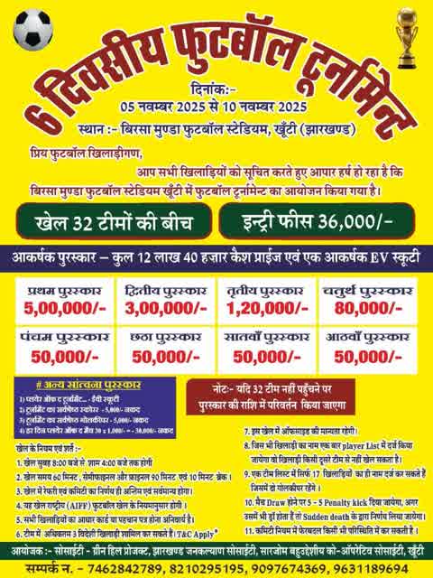झारखंड के खूंटी स्थित बिरसा मुण्डा फुटबॉल स्टेडियम मे कुल 12 लाख 40 हजार कैश प्राईज एवं एक आकर्षक EV स्कूटी वाली 6 दिवसीय फुटबॉल प्रतियोगिता का आयोजन किया जा रहा है। आगामी 05 नवम्बर 2025 से 10 नवम्बर 2025 आयोजित फुटबाल प्रतियोगिता का प्रथम पुरस्कार 5 लाख, द्वितीय पुरस्कार 3 लाख, तृतीय पुरस्कार 1.20 लाख, चौथा पुरस्कार 80 हजार, पांचवा, छठा, सातवां एवं आठवां पुरस्कार 50-50 हजार रुपए रखा गया। इस प्रतियोगिता में कुल 32 में भाग लेगा। प्रतियोगिता में प्रवेश शुल्क ₹36000 रखा गया। इस प्रतियोगिता का आयोजन सोसाईटी – ग्रीन हिल प्रोजक्ट, झारखण्ड जनकल्याण सोसाईटी, सारजोम बहुउद्देशीय को-ऑपरेटिव सोसाईटी, खूँटी के द्वारा किया जा रहा है।