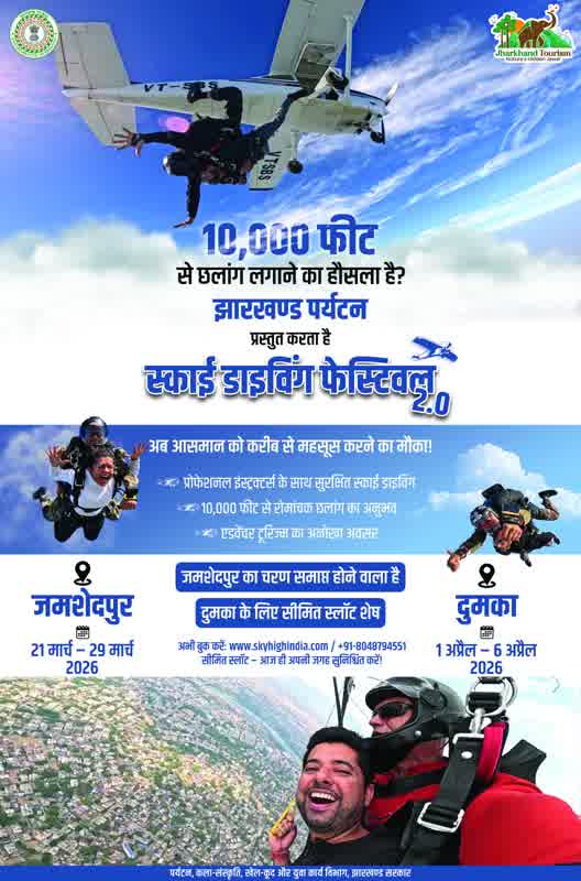 खुले आसमान, तेज हवा और रोमांच से भरपूर यह अनुभव प्रतिभागियों के लिए जीवनभर की याद बन सकता है। झारखंड की प्राकृतिक वादियों के ऊपर से स्काई डाइविंग करने का मौका पर्यटकों को प्रकृति से एक अलग तरह का जुड़ाव भी प्रदान करेगा।